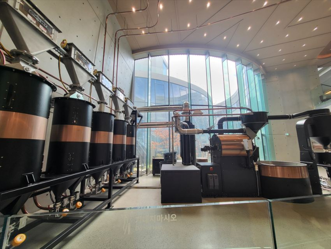 ここはコーヒーロースターとして釜山でとても有名なんです。この大きな機械でコーヒーをローストしています。