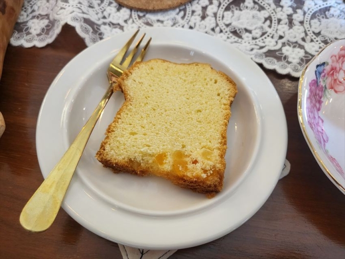 紅茶と一緒に提供されるのは、しっとりと甘いパウンドケーキ。紅茶の渋みとほんのりとした甘さの、絶妙な組み合わせです。