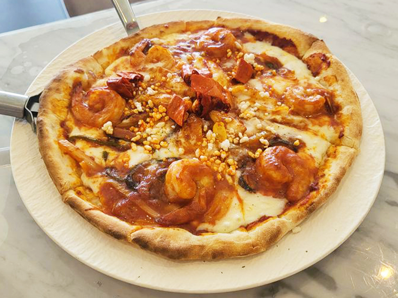 続いて登場したのは、中華風窯焼きピザ『麻辣チャンポンピザ(마라 짬뽕 피자)』(29,000ウォン)。