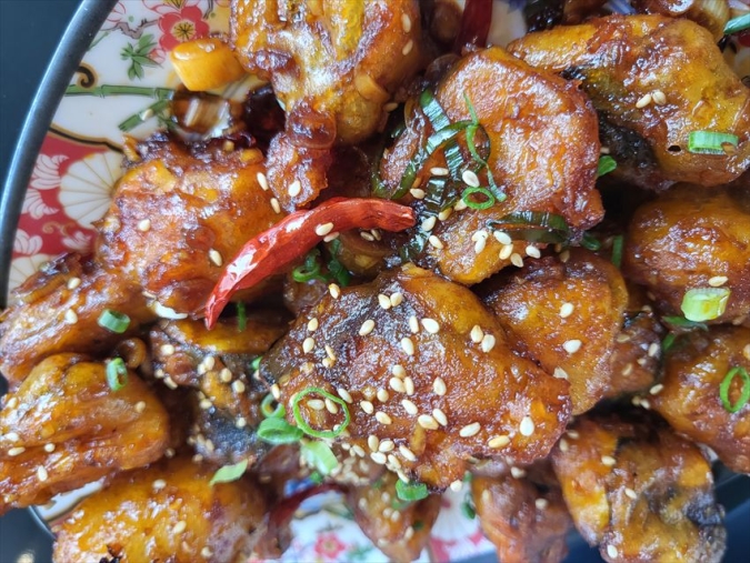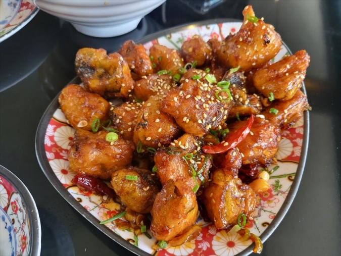『ナスの揚げ物(가지튀김)』(13,000ウォン)は揚げたてのナスにピリ辛&甘みのあるタレを絡めた一品。熱々すぎて一口目で口をやけどしそうになるほど!
