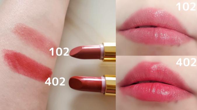 個人的にもイチオシのプチプラリップです。今回は、全7色のうち102(ブラウン系)と402(レッド系)を使ってみました。