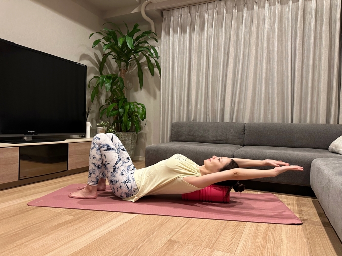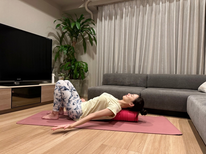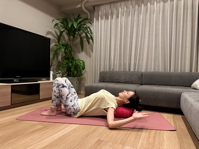 (1)フォームローラーを縦に置き、ローラーの上に背骨を置くように仰向けになって上半身と頭をのせる。この時に腰が反らないようにして床にゆったりと下ろす。足は膝を立てておく。