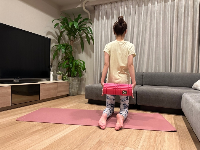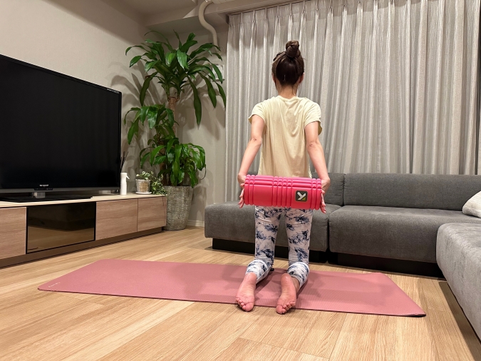 このとき首や肩に力が入りやすいので、上半身はリラックスして。ゴリゴリ転がすのではなく、ゆら〜っと動かすのが◎。