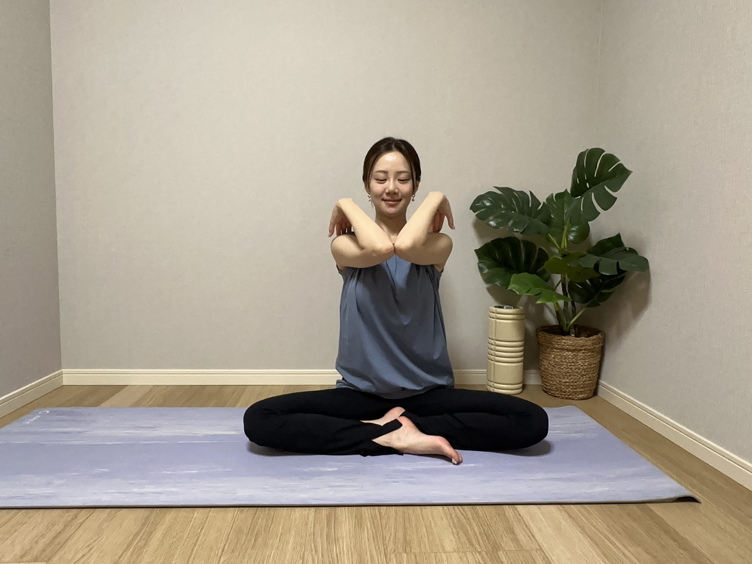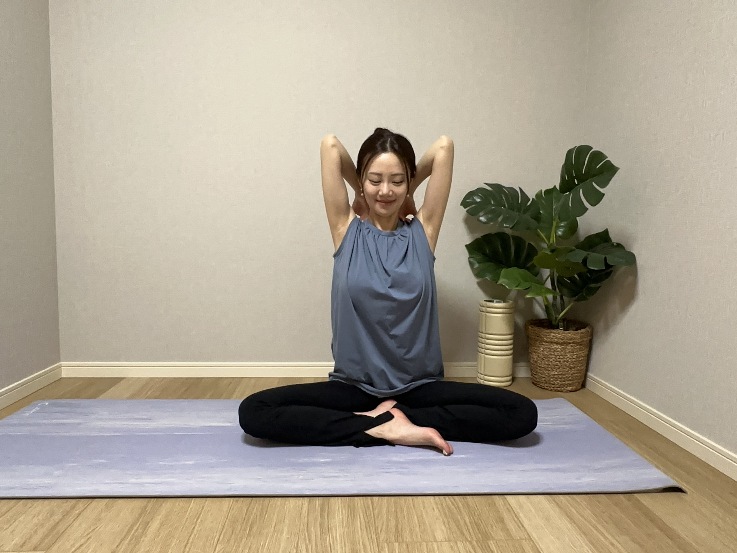 (1)あぐら、または椅子に座り、背筋を伸ばす。両手の指先を肩に軽く添える。
