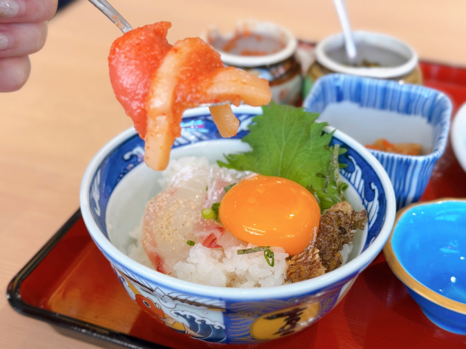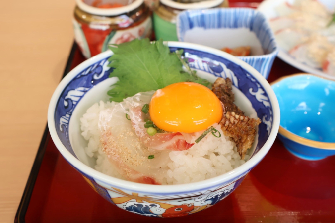 (2) Next, top with egg yolk to create a luxurious TKG (raw egg on rice). When eaten with the fragrant deep-fried sea bream skin and condiments that come separately, you can enjoy the contrast in richness and texture.