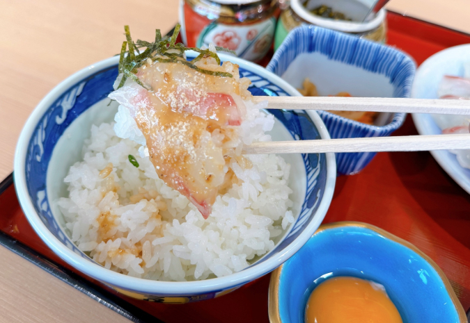 (1) First, place the sea bream sashimi on rice and pour the "special white sesame sauce" over it "Tai-don style." The rich white sesame sauce brings out the flavor of the sea bream, creating a mellow taste!