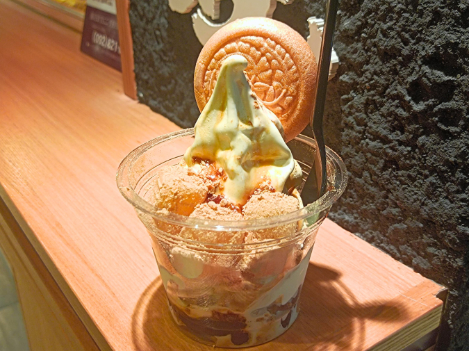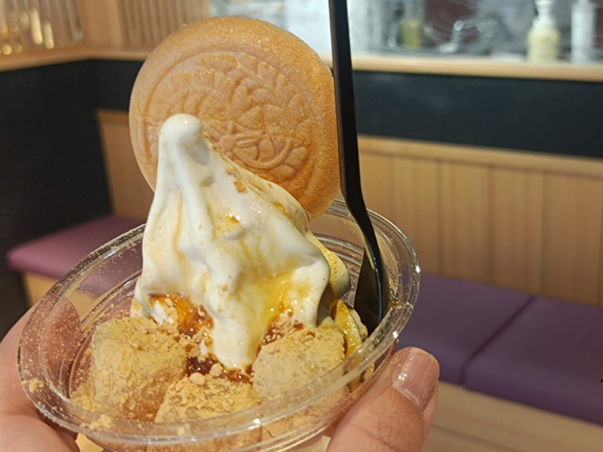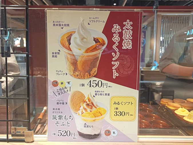 The two cups are the "Taikoyaki Milk Soft" (450 yen), which is filled with flakes, warm "Kurodahan Taikoyaki", homemade black bean paste, and soft serve ice cream, and the "Chikushimachi Soft" (520 yen), which is filled with homemade black bean paste, three of their signature "Chikushimachi", soft serve ice cream topped with "Chikushimachi" kinako and brown syrup, and a monaka shell.