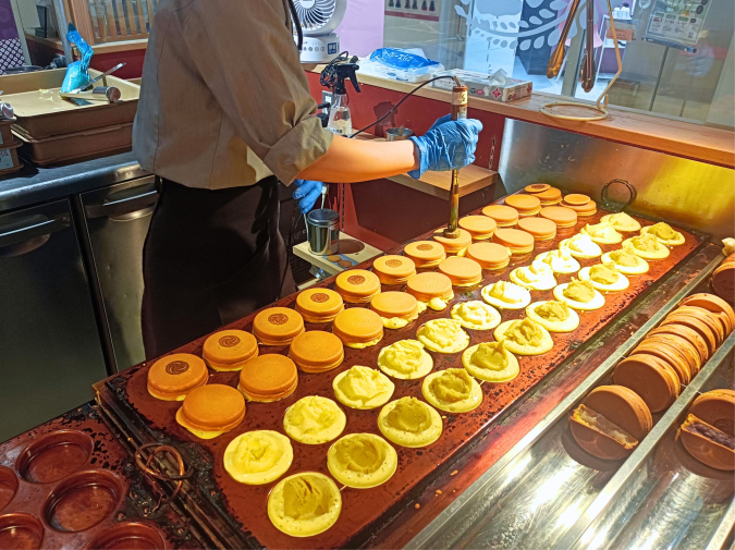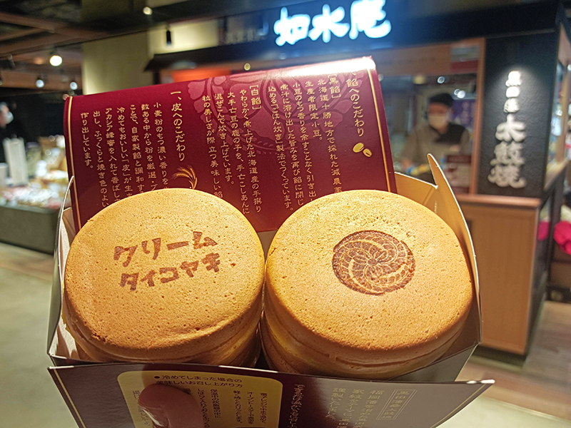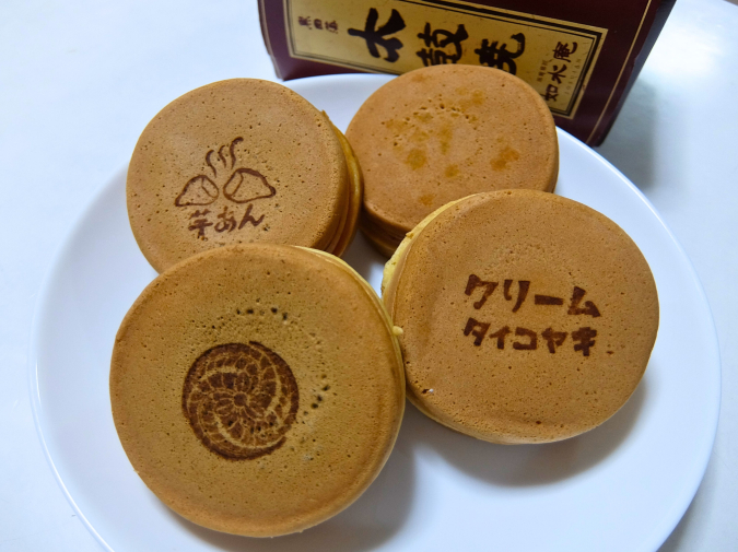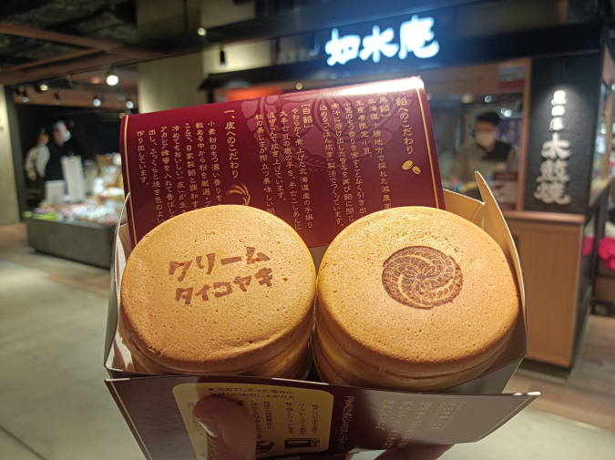 This time, I tried four different flavors: black bean paste, white bean paste, sweet potato bean paste, and custard cream. I was told that the name "Taikoyaki" comes from the fact that it resembles the shape of a drum.
