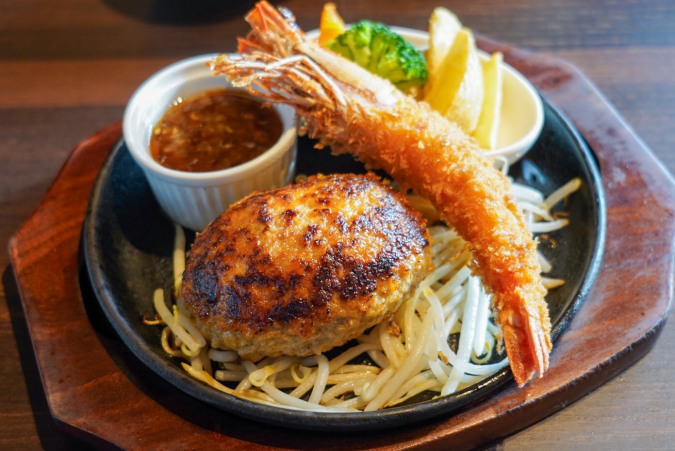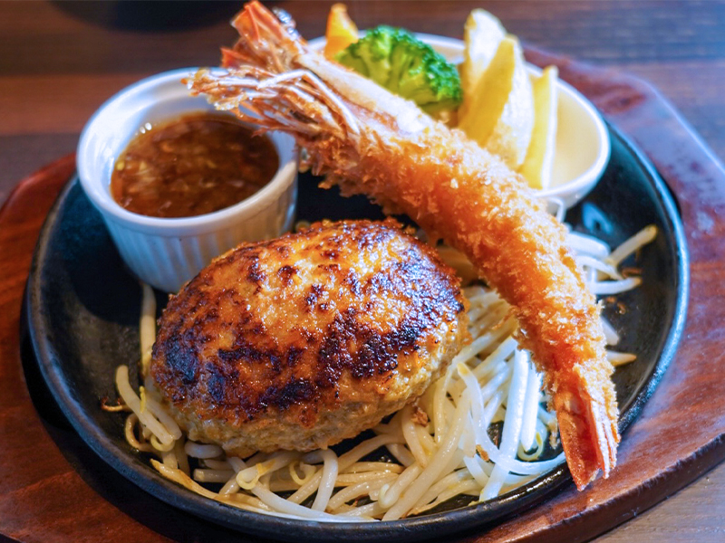 The "Hamburger Steak and Fried Shrimp" (Set A 1,770 yen, Set B 2,020 yen) is a menu item consisting of a "handmade hamburger steak" topped with a large fried shrimp.