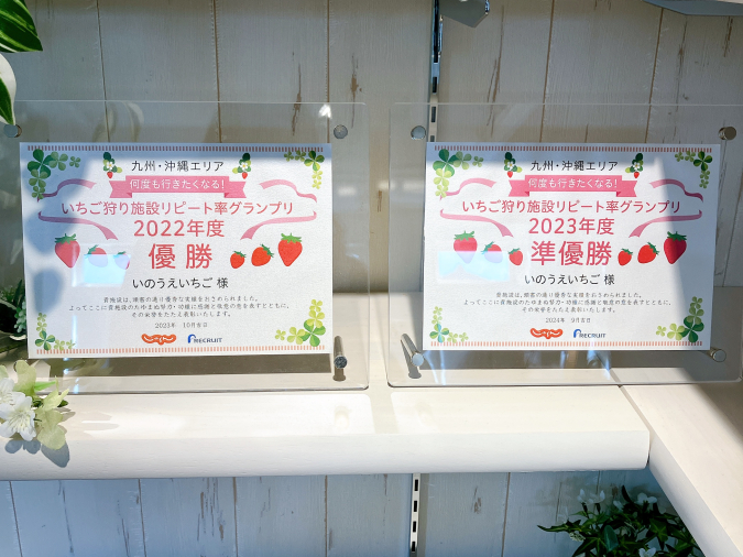 In fact, Inoue Strawberry is the 2022 winner and 2023 runner-up of the Strawberry Picking Facility Repeat Rate Grand Prix in the Kyushu and Okinawa area, which is held annually by Jalan. It is a popular strawberry picking spot loved by many people.