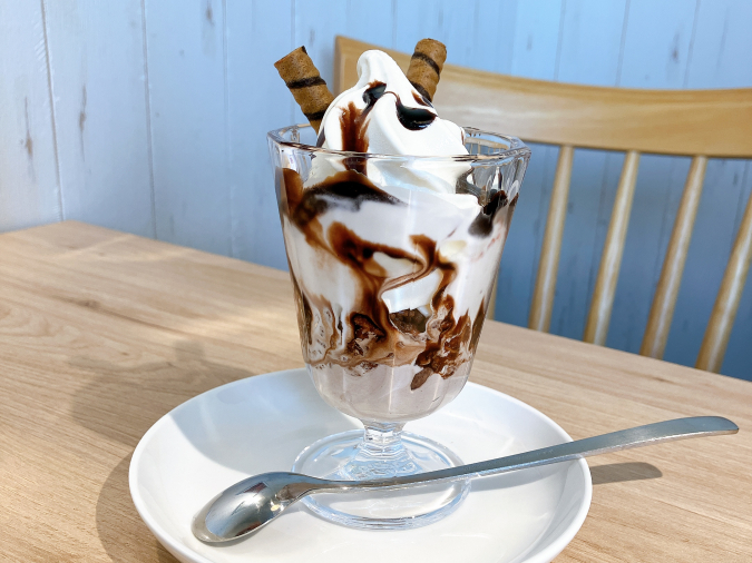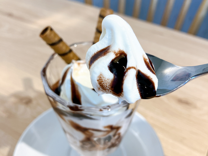The rich vanilla soft serve ice cream is topped with plenty of chocolate sauce, making it sweet and delicious.