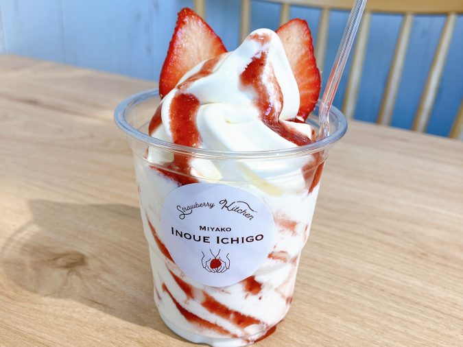 The shop's recommended item is the "Soft Serve Ice Cream" (650 yen), which is vanilla soft serve ice cream topped with strawberry sauce. Take-out is also available.