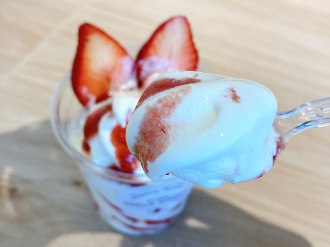 Under the whipped cream is "Strawberry Milk Panna Cotta". Its refreshing sweetness is addictively delicious. By the way, there is also a limited quantity of "Strawberry Milk Panna Cotta" (300 yen) available separately.
