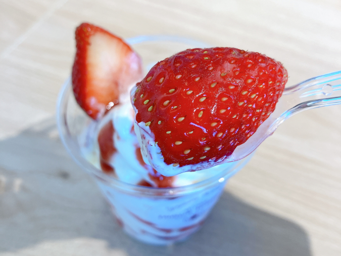 The soft serve ice cream has a rich and simple vanilla flavor that brings out the deliciousness of the strawberries. It is topped with a generous amount of Star Night strawberry sauce, which goes perfectly with the ice cream, making it the perfect match!