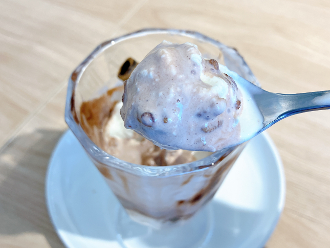As I continued to eat it, I discovered strawberry sauce. There was also chocolate cream with cheese at the bottom, and the subtle sourness of the strawberries and cream cheese was exquisite! The crunchy rice puffs were also irresistible.