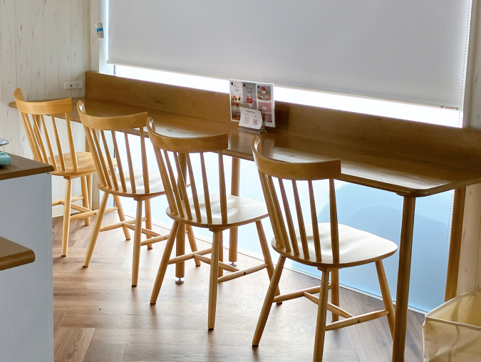 The cafe has a bright and calm atmosphere, with four seats at the counter,