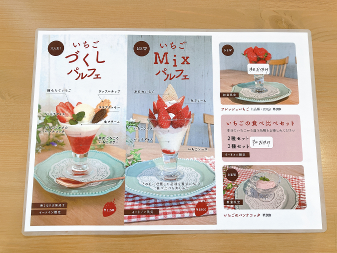 The shop boasts over 10 types of strawberry sweets, including the classic "Soft Serve Ice Cream" (from 450 yen) which is also available for takeout, and the eat-in only "Parfait" (from 1,150 yen)!