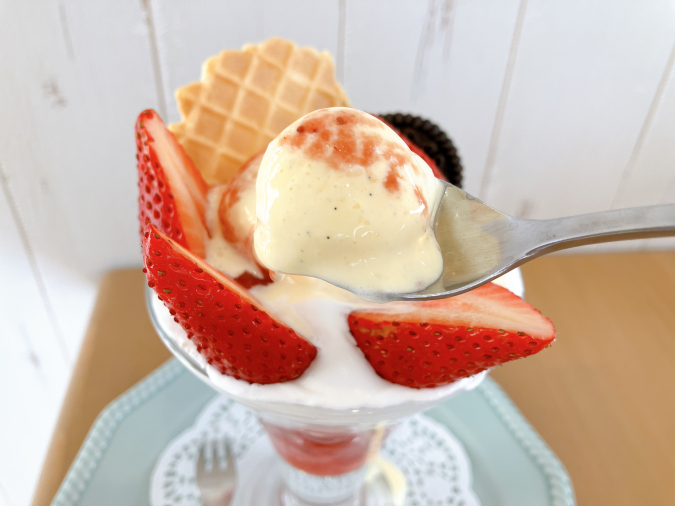 The vanilla ice cream is topped with strawberry sauce, and the sweetness of the vanilla ice cream and the sourness of the strawberries are a perfect match!