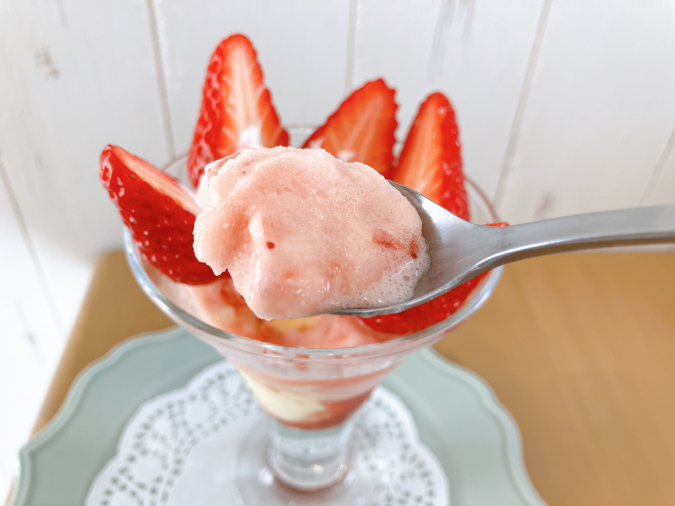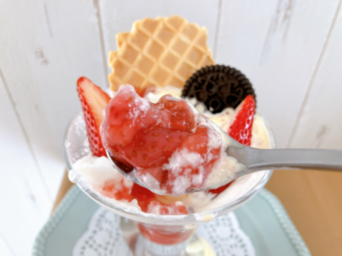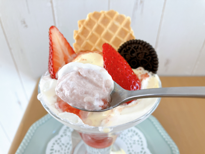 Under the strawberries is fresh cream and strawberry ice cream. The strawberry ice cream has a nice sour taste and a refreshing flavor.