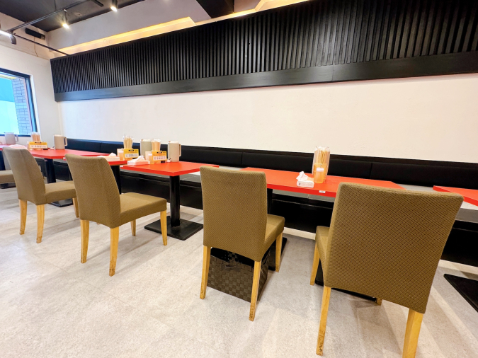 The restaurant has a clean and impressive interior with impressive red tables. There are 21 seats in total, including 5 counter seats and 4 tables for 4 people.