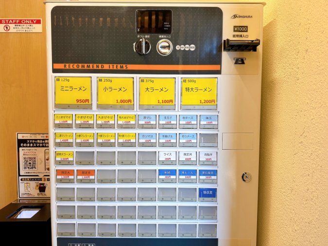You buy your meal ticket from the ticket machine and pay in advance. They offer "Ramen," "Mazesoba," and "Buta Mashi Ramen," and you can choose the amount of noodles for each from "Mini" at 125g, "Small" at 250g, "Large" at 375g, and "Extra Large" at 500g.