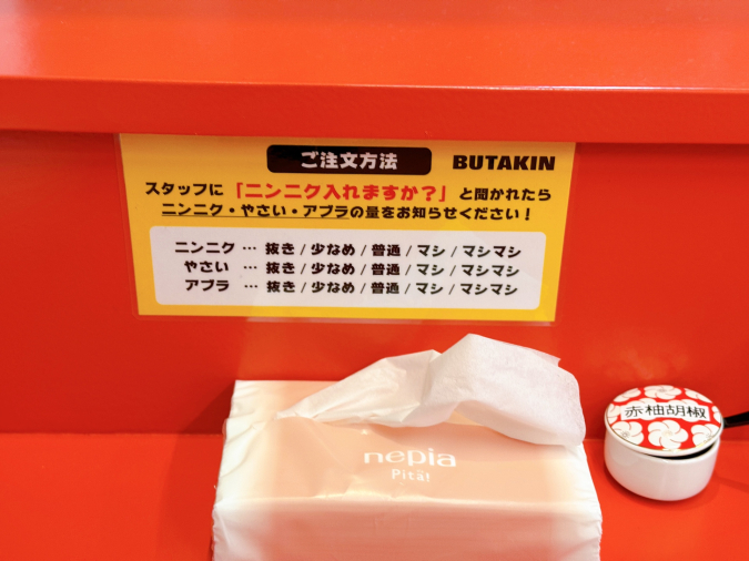 When you hand over your meal ticket, the staff will ask you how much garlic, vegetables, and oil you would like, which are essential to a Jiro-style ramen. You can choose from five levels of each: none, a little, normal, extra, and extra extra. They will explain each option in detail, so even beginners can feel at ease.