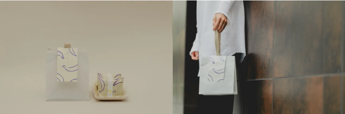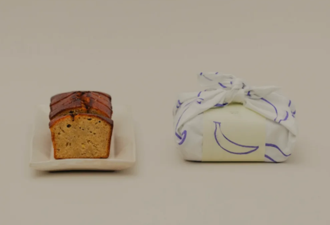 The paper bag is made of wax paper, a reusable material just like the furoshiki. Its unique texture enhances the appeal of the banana bread.