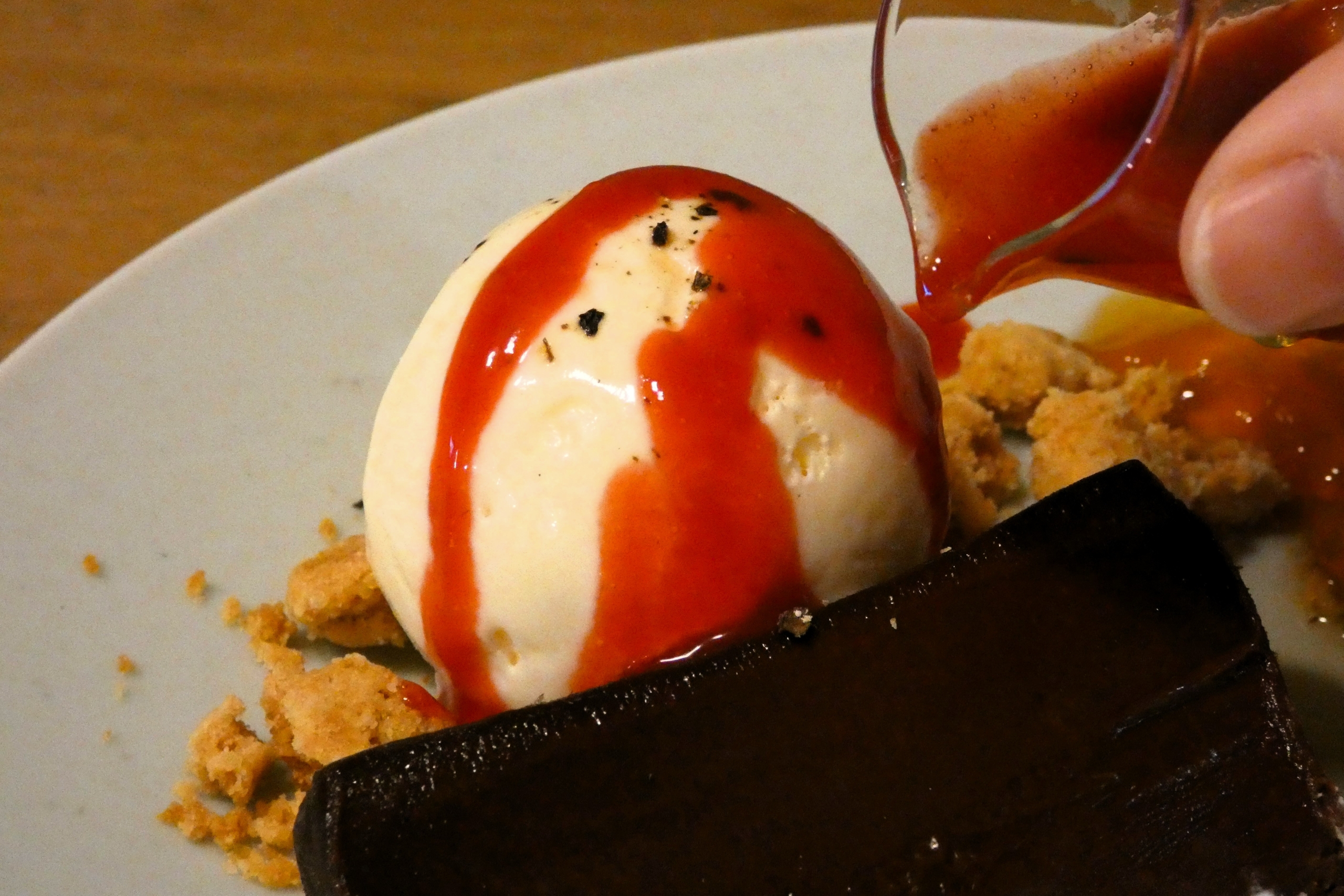 そこに、ミルクアイス、アーモンドクランブル、フランボワーズソース、和紅茶ジュレ、コーヒークリームのチョコブッセ、きび砂糖のメレンゲと浜御塩を使ったムラングシャンティが美しく盛り付けられています。