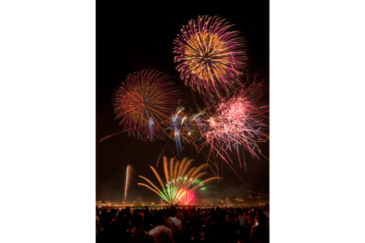 会場と打ち上げ場所の距離が近いのも魅力で、大迫力の花火を仰ぎ見ることもできます。川面に映る花火もとても美しいですよ。