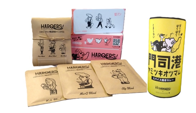 『ブレンドコーヒー』(3袋、648円)、官営八幡製鐵所で大正時代に従業員の栄養補助のために作られた『堅パン』(540円)、門司港発祥の焼きカレーのスパイスを絡めた大豆のおつまみ『門司港ヤミツキオツマム スパイス焼きカレー』(697円)など、どれも パッケージがインパクト大。