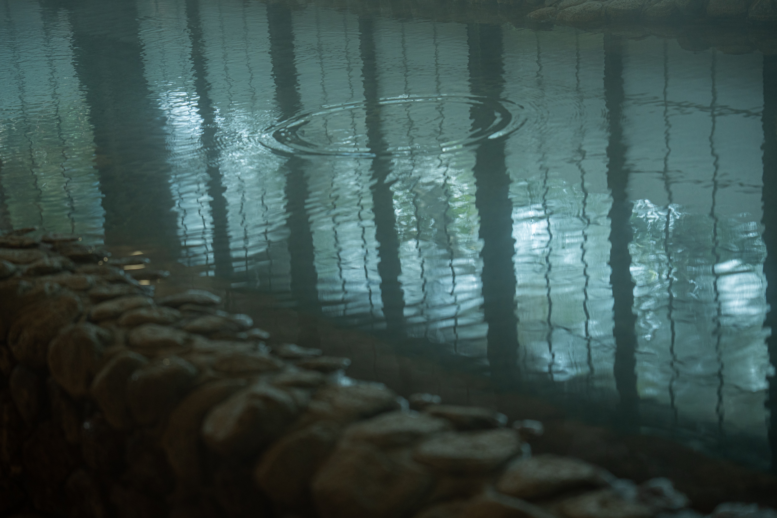 自然の川と滝つぼをイメージしたという源泉掛け流しの大浴場。石積みの浴槽が手仕事ならではの有機的な曲線を描き、湯けむりが腰窓の奥に広がる緑をおぼろげに滲ませ、まるで幽玄の世界。