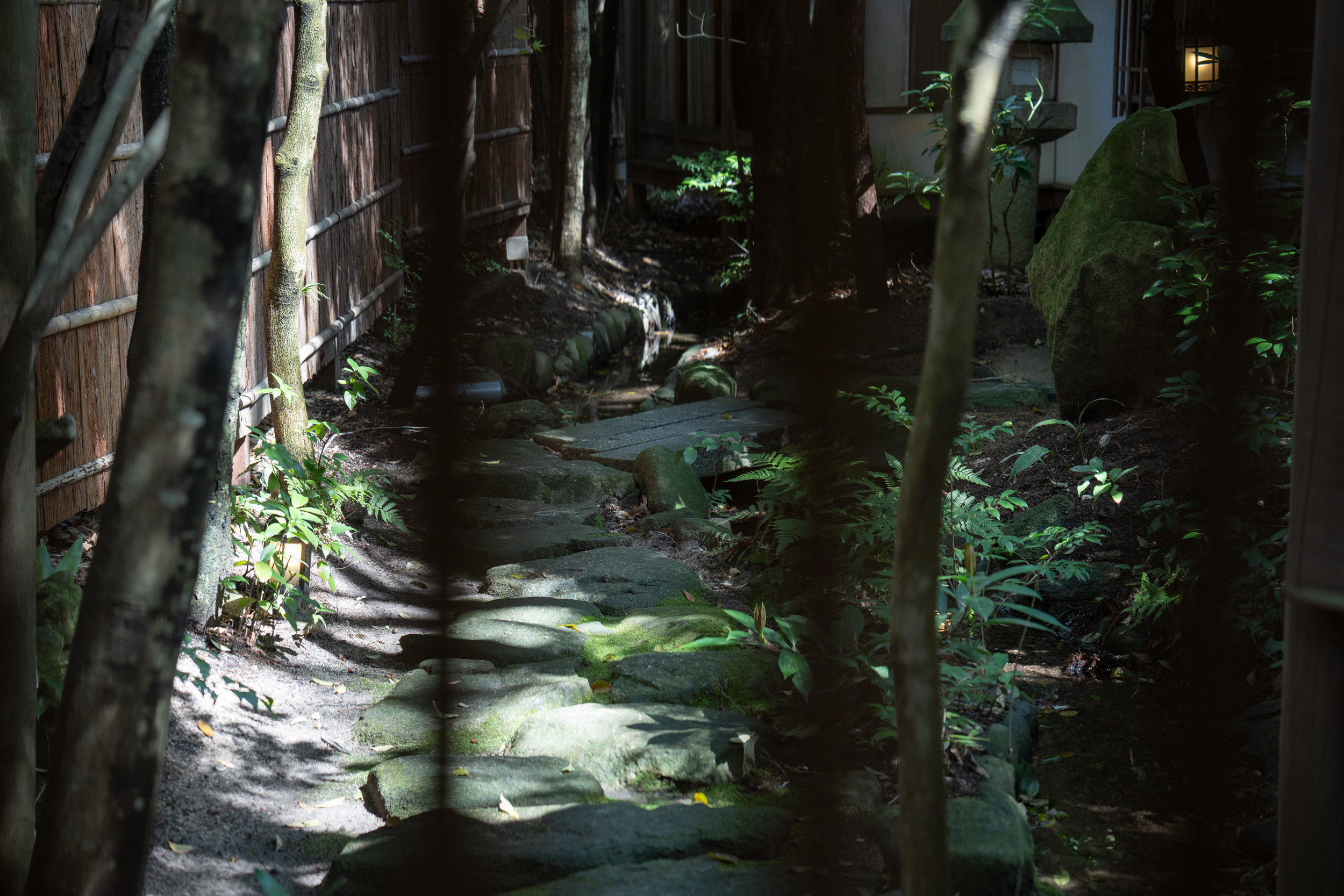 脱衣スペースもまた印象的で、陶器製の番号札が添えられた脱衣籠、竹の編み込み細工の壁、大理石の洗面台と、美しい上に快適。湯上がりまで心地よさが続き、体の芯まで温まったあとは庭園散歩……というのも最高の過ごし方。宿泊者は、朝風呂もぜひ楽しんでくださいね。
