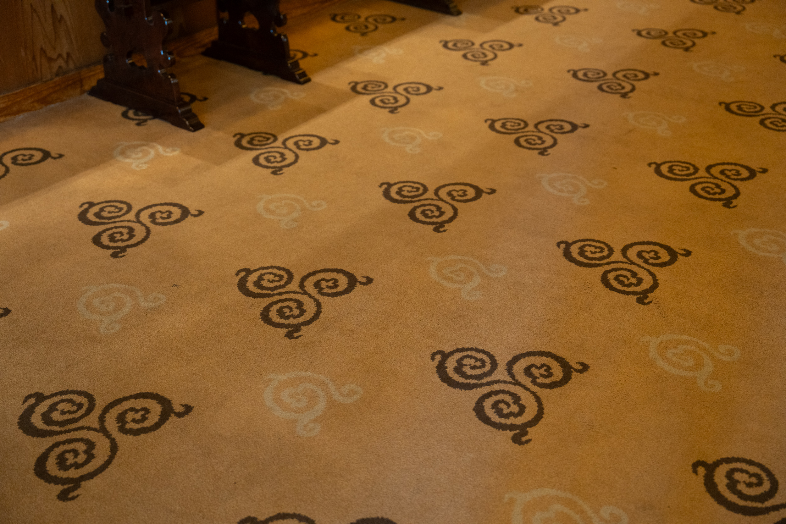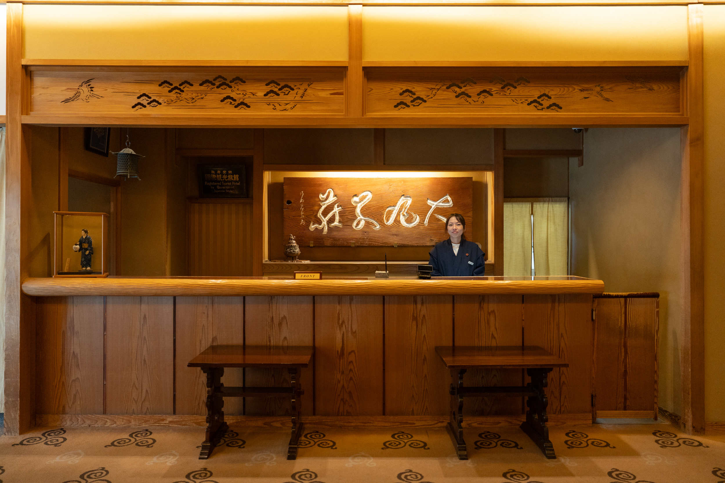 暖簾をくぐり、チェックイン。エントランスに敷かれた絨毯のクルクル模様がかわいらしく、この渦巻き模様は「温泉には魂がある」と語っていた先々代の4代目当主がデザインした湯玉がモチーフだとか。