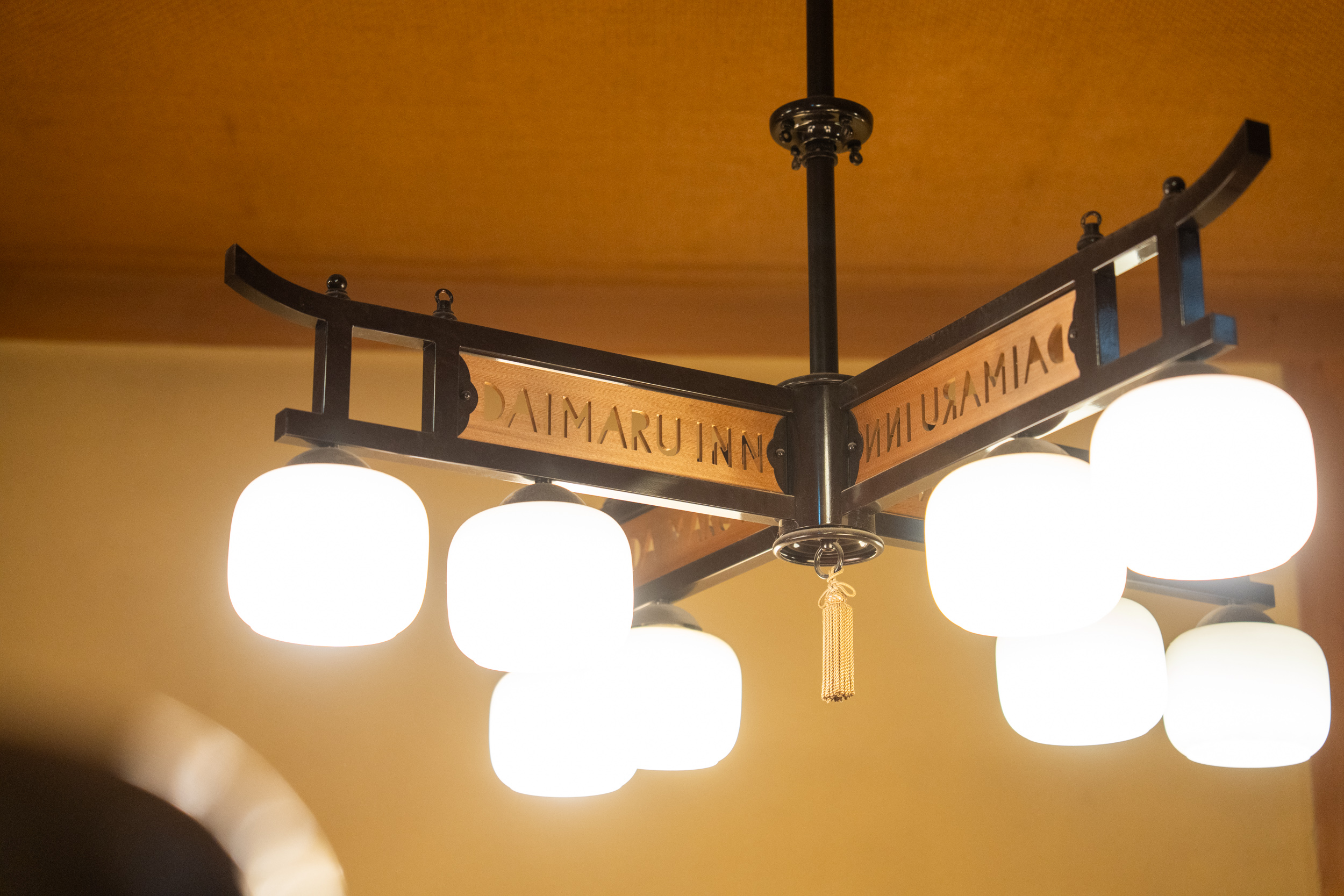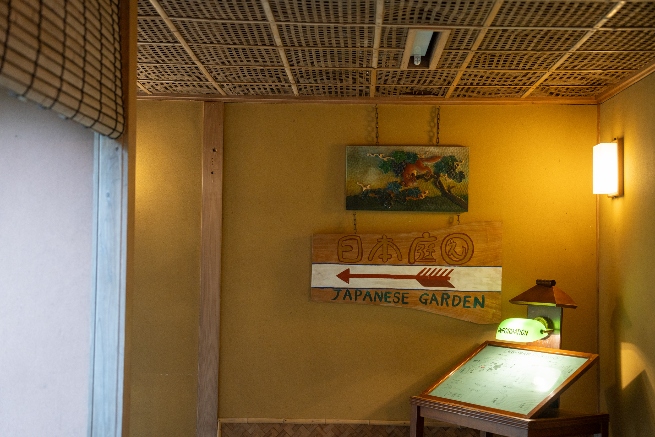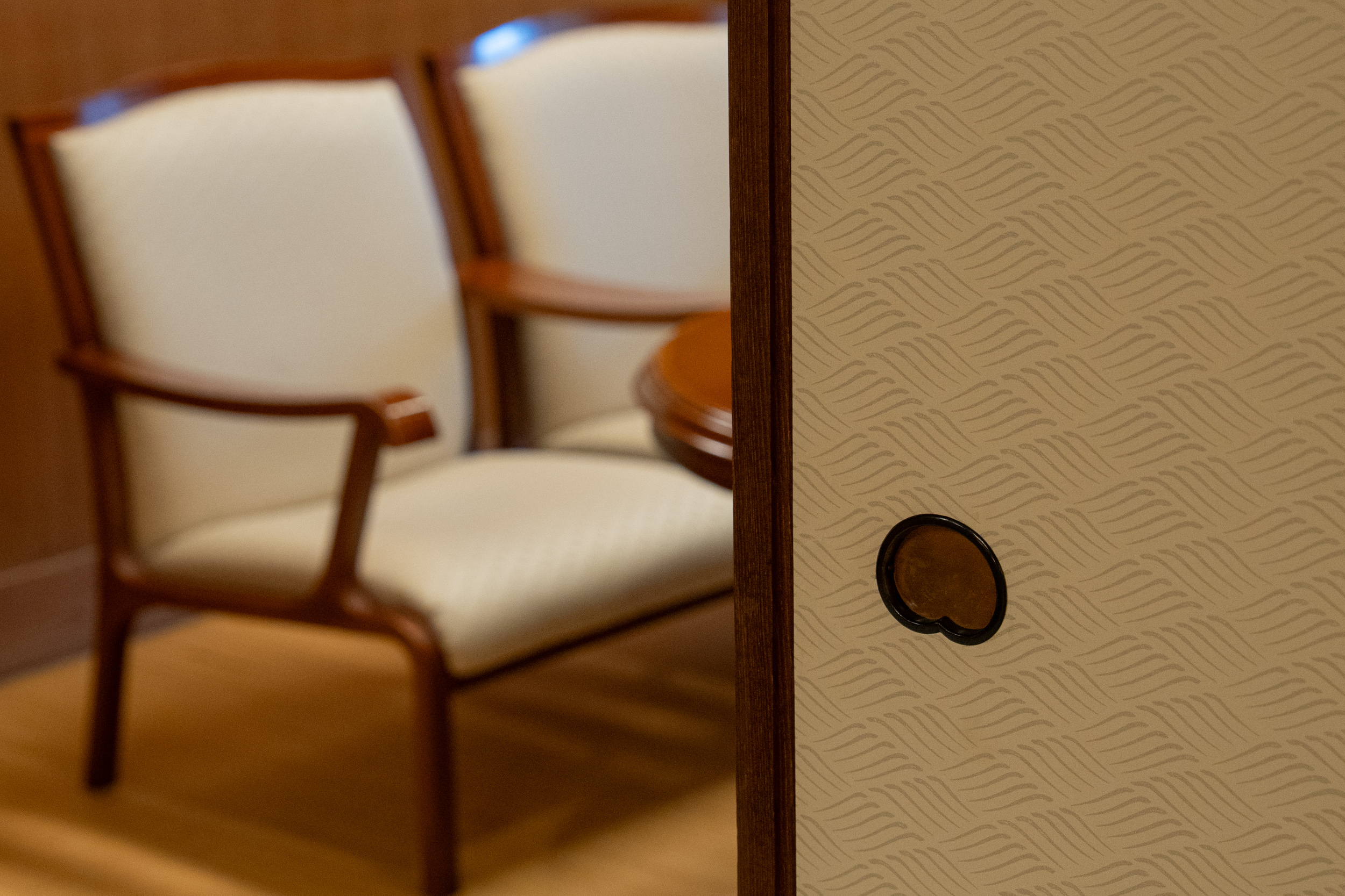 「迎賓の間」は、ブルーとイエローの絨毯に格子窓と障子が映える、和洋折衷のレトロモダンな空間。ヨーロッパの曲木家具を思わせるアームチェア、欄間や組子の繊細な意匠、アールデコを感じさせる壁面の装飾パネル── 和の素材と洋のデザインが調和し、大正から昭和初期にかけての日本のモダニズムを彷彿とさせます。天井を見上げると、数寄屋造りに見られる精緻な天井装飾が施され、随所に配された美学と伝統技術の結集に、思わず感嘆の声が漏れてしまうのは私だけでしょうか。