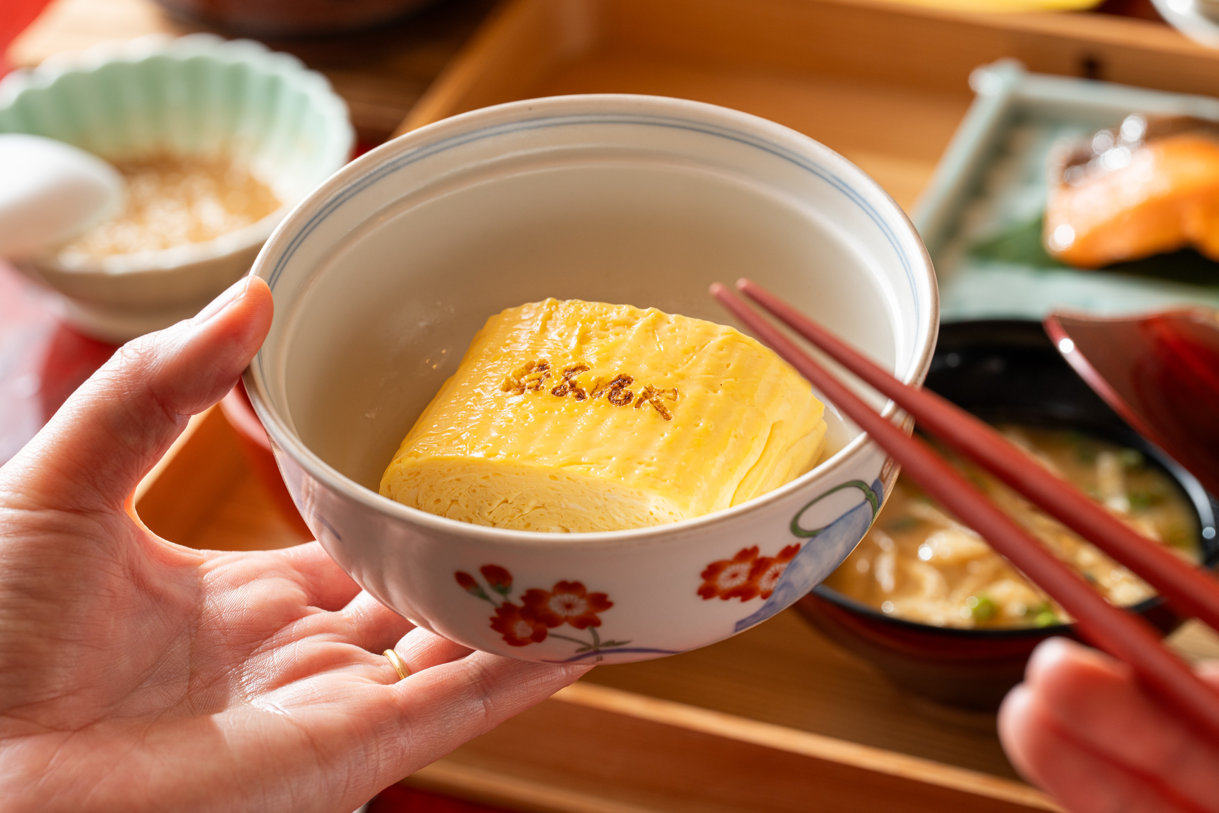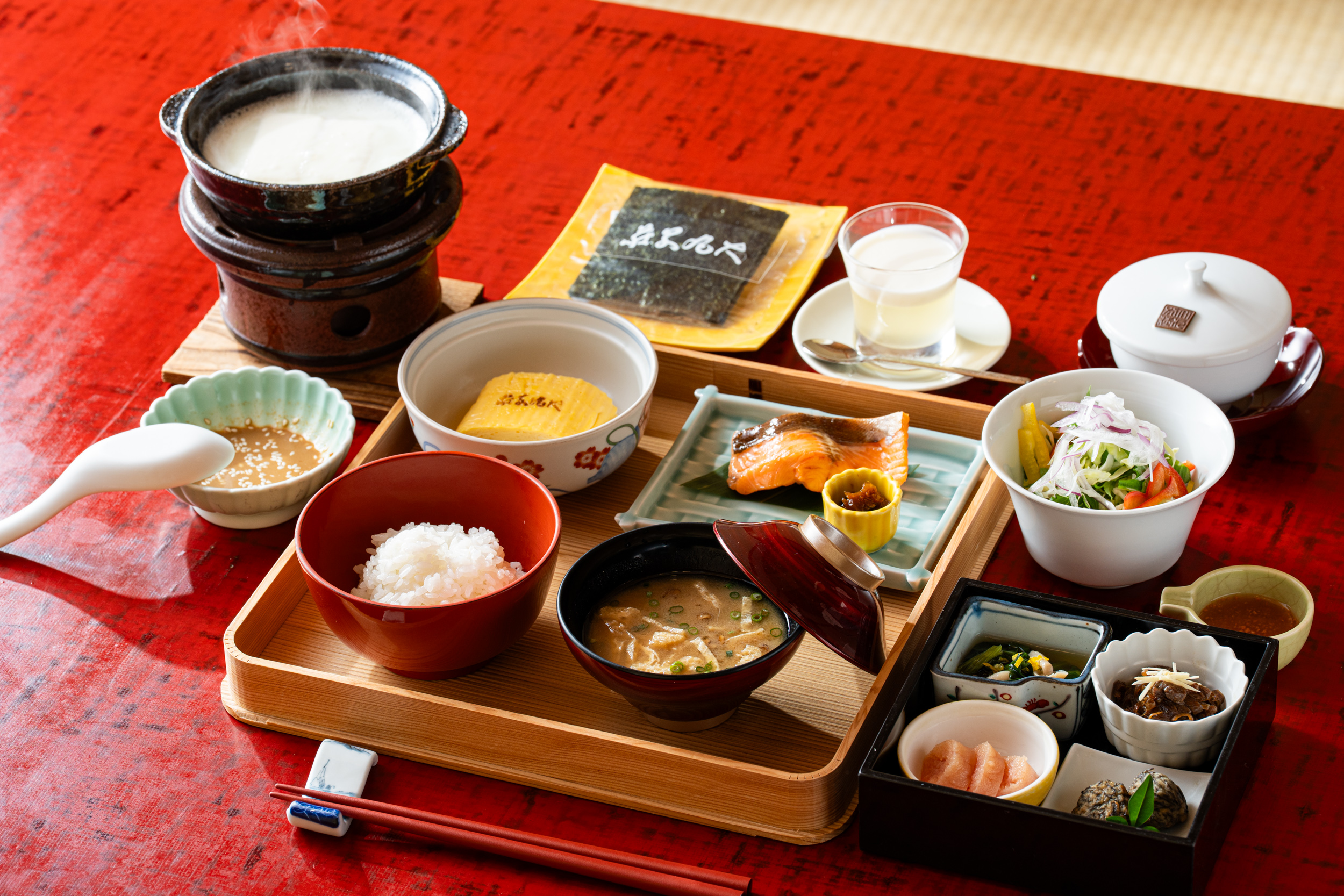 ぐっすり眠った翌朝は、地産地消を凝縮した朝食を。名物のだし巻き玉子は、JR九州ファーム『うちのたまご』を使い、出汁をきかせたやさしい味わい。また、糸島直送もずくのさつま揚げ、明太子の老舗『楢﨑商店』の青唐辛子明太子、伊万里牛のしぐれ煮、有明海産『一流浜』の焼き海苔と、小鉢の一つひとつに九州・福岡が誇る食の実力が詰まっています。