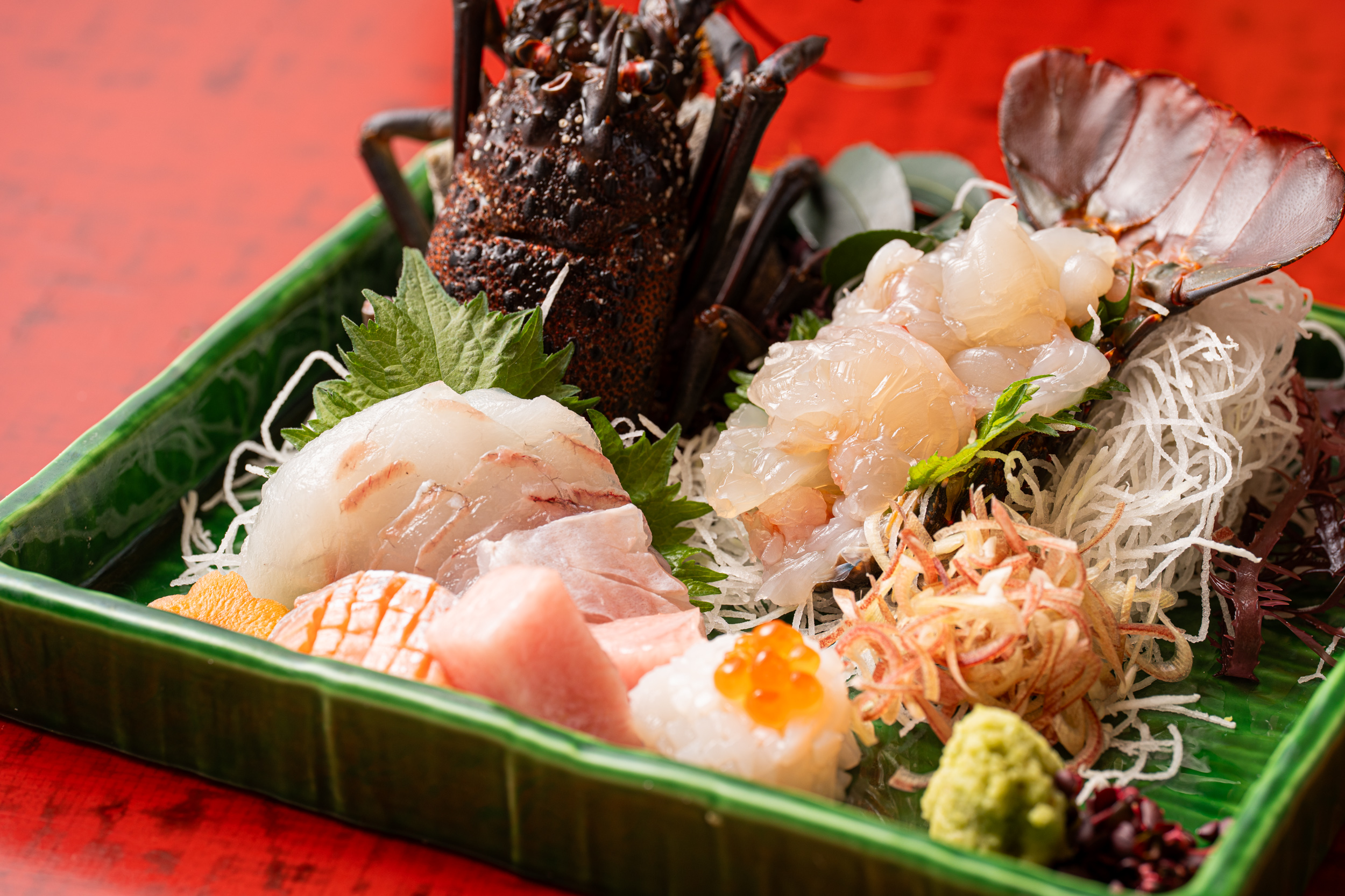 八寸はミル貝とホタルイカのうるい、合馬産筍と木の芽味噌田楽など、春の彩りが凝縮された一皿。続く造りは、圧巻の伊勢海老の姿造り。透き通るような身の美しさに、思わずゴクリ。よもぎ豆腐と鮑を合わせた椀物で舌をととのえ、海老芋の小判揚げ、脂ののった赤ムツの焼き物へ。