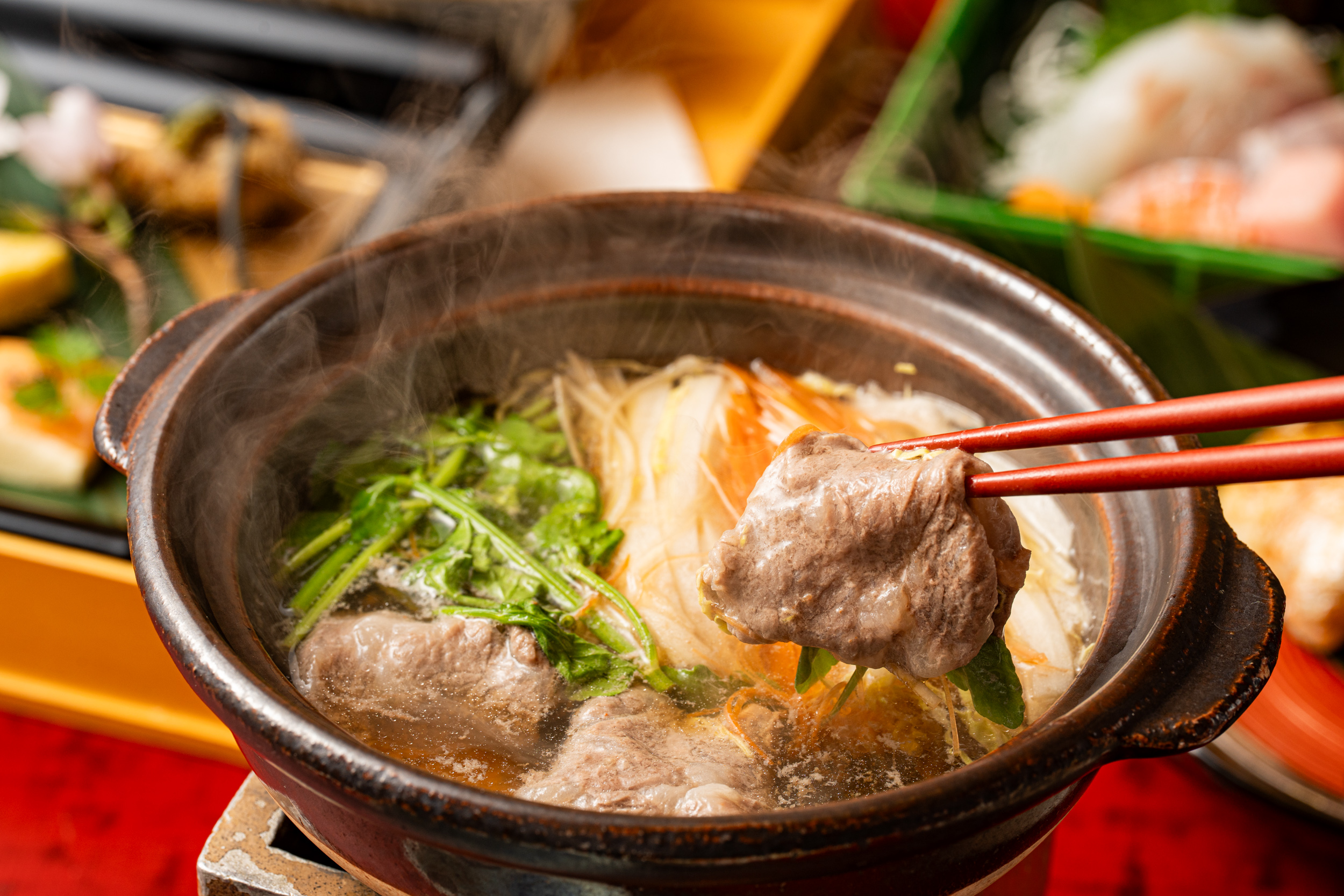 鍋物のはりはり鍋は、熊本産馬肉のとろけるようなやわらかさと深い旨みが鮮烈で感動的。野菜のしゃきしゃきとした食感と、さっぱりとした後味も軽やかな春の気配を感じさせます。