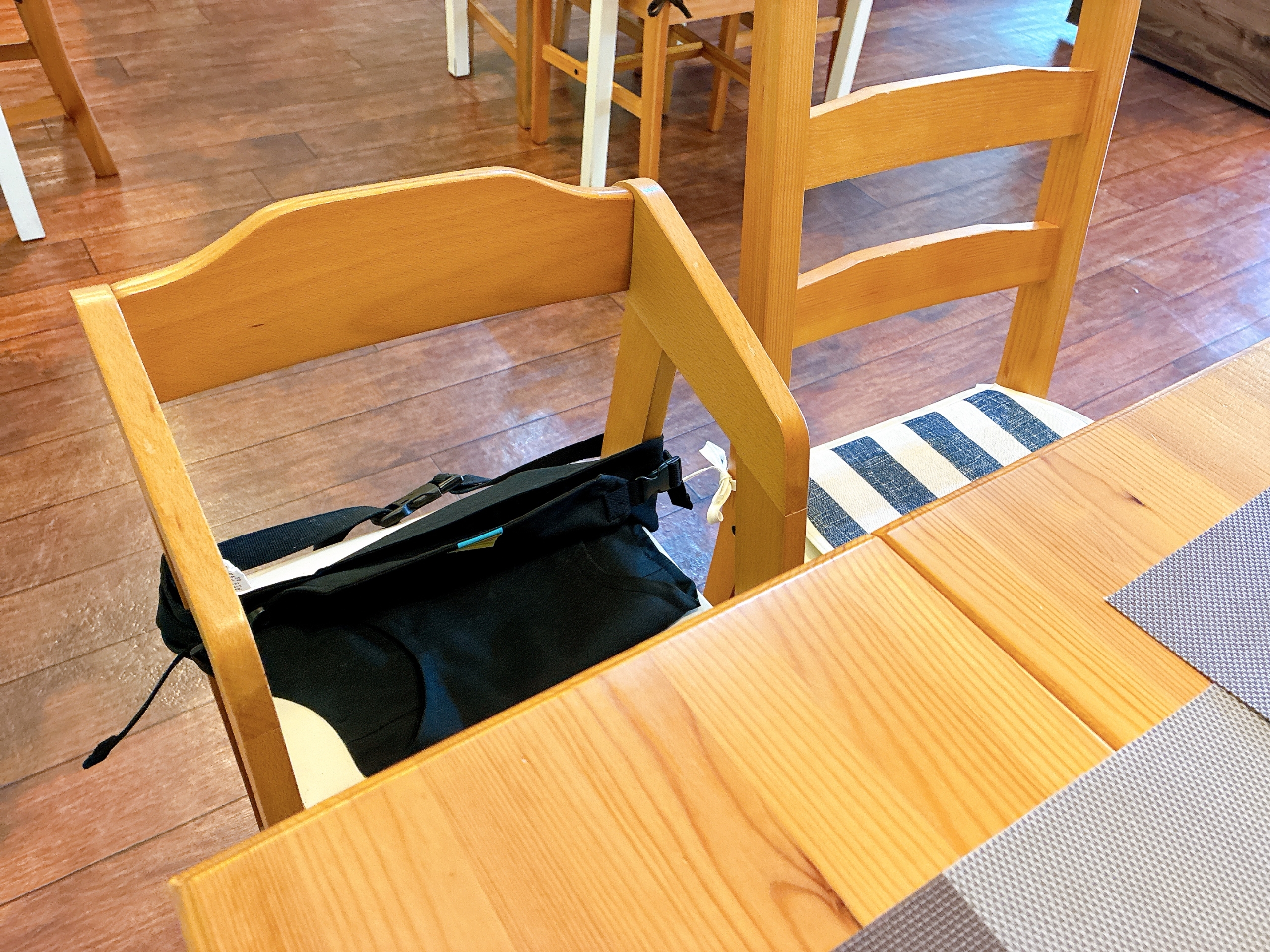 ベビーチェアも用意されています。広々としていてベビーカーのまま入店も可能なので、お子さま連れでも安心です。