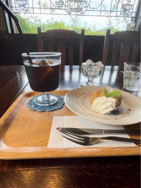 一緒に運ばれてきたコーヒーは自家焙煎の豆を使用して淹れるこだわりの一杯です。コーヒー(アイス/ホット)のほか、紅茶(アイス/ホット)、アップルジュース、オレンジジュース、マンゴージュースが選べます。