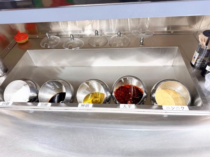 調味料コーナーには砂糖や黒酢、麻油などが置いてあるので、好きにアレンジすることもできますよ。辛さに自信がある人は大辛を追加してもよさそう。まずは一口食べてから追加していくことをおすすめします。