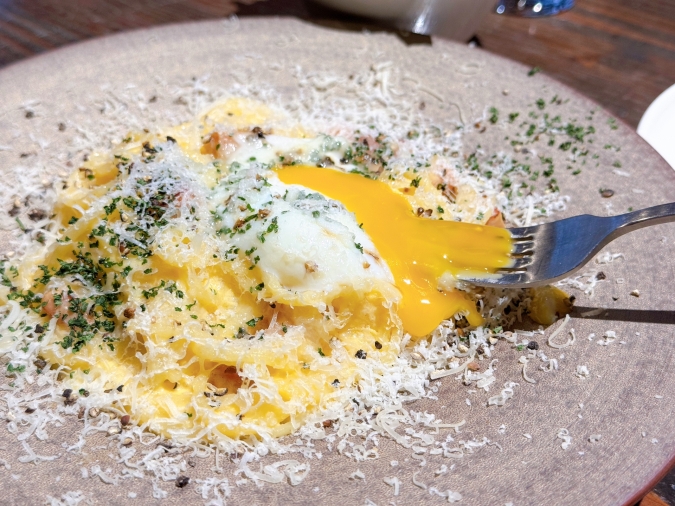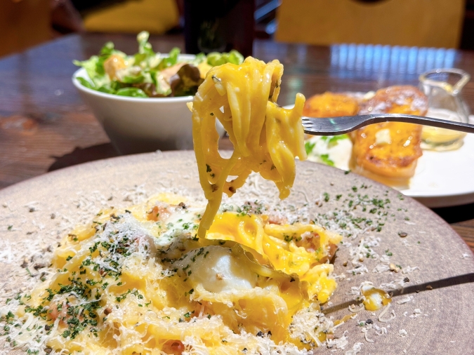 絶妙な硬さの半熟卵には那珂川市の『フジノ香花園』の『金太郎卵』(有精卵)を使用。フォークで割るととろりとした卵がカルボナーラにまったりと絡みます。