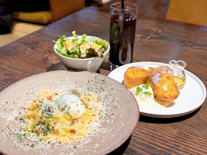 名物「金太郎カルボナーラ 63.5℃の半熟玉子添え」&昼限定「富士茶房フレンチトースト~あんこを添えて~」