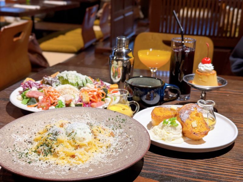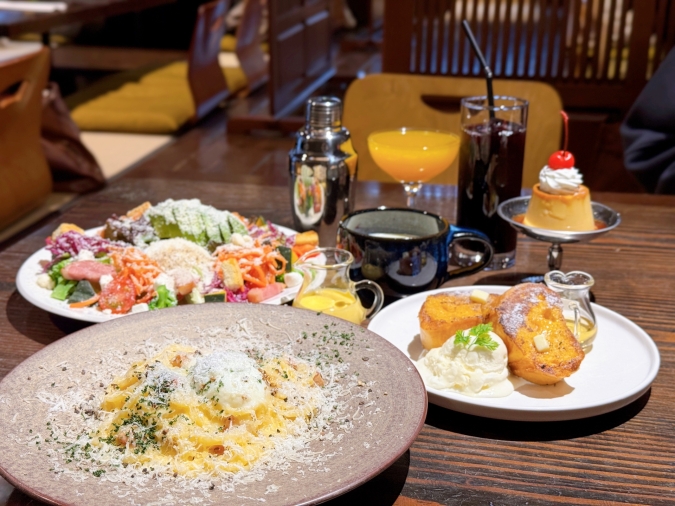 食事は、こだわりのもちもち食感の「生パスタ」のほか、ふわふわもちもち「ハンドトス」と薄くてサクサク「クリスピー」から生地が選べる「ピッツァ」、スープ付きの「サラダボウル」のほか、アラカルトやスイーツが揃います。