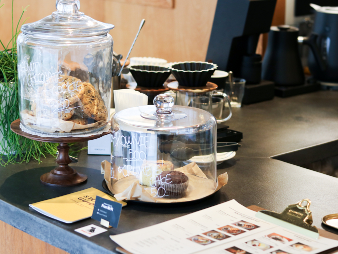 カウンター横にはクッキーやクランブルケーキなど自家製の焼き菓子もあり、コーヒーやラテのおともにぴったりです。