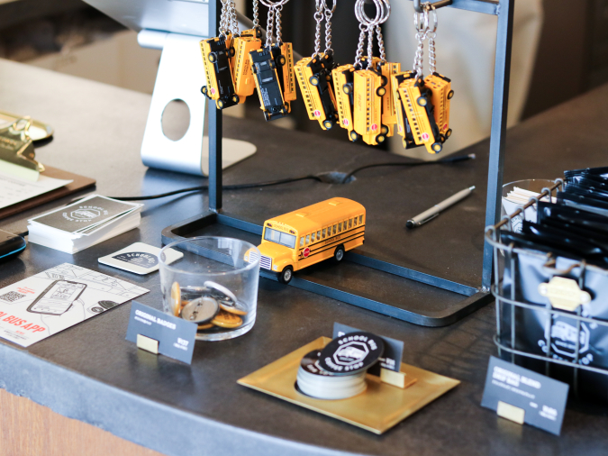 キーホルダー『MEMBER’S SCHOOL BUS(メンバーズスクールバス)』(900円)は来店時に提示すると毎回、ドリンクが30円引き、フード&ドリンクのセットは50円引きになるうれしい特典付きです。