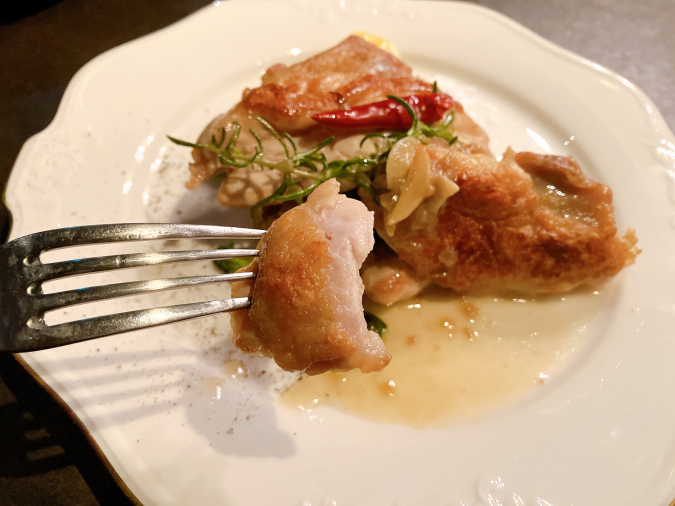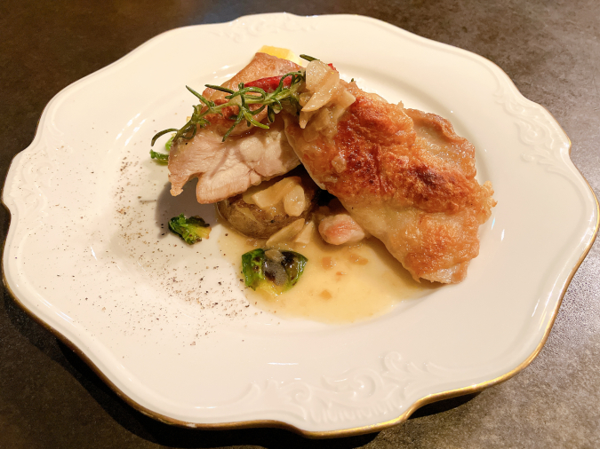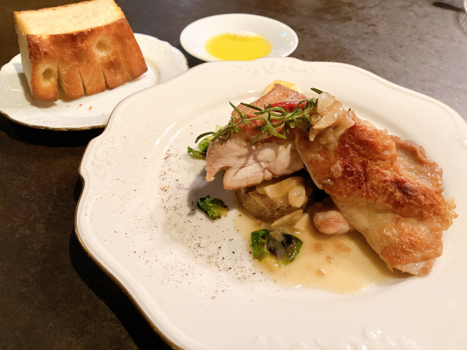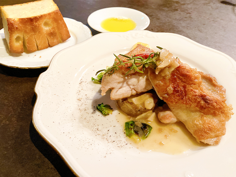 肉料理は『長門長州どりもも肉のガーリックソテー』(プラス料金なし)、『萩むつみ豚のロースト』(+400円)、『長萩和牛もも肉のロースト』(+1,200円)の3種類から選ぶことができ、今回は『長門長州どりもも肉のガーリックソテー』をチョイスしました。