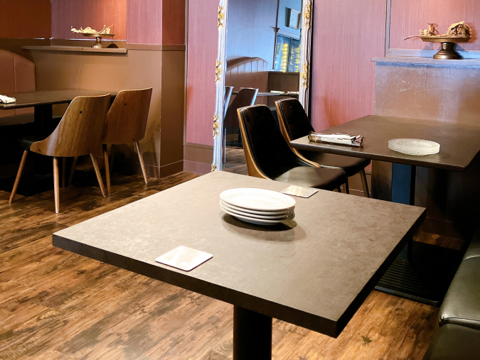 店内はシックで落ち着いた雰囲気。2人掛け・4人掛けテーブル席が全部で70席ほどあり、広々としています。