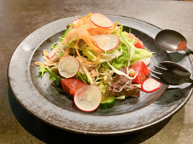 まずはサラダミストから。キャベツ、水菜、にんじん、トマト、ツナ、ラディッシュ、きゅうりなど、数種類の野菜が入っていて彩りがとってもきれい! みずみずしい野菜と酸味の効いたドレッシングがよく合います。