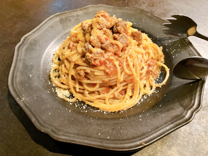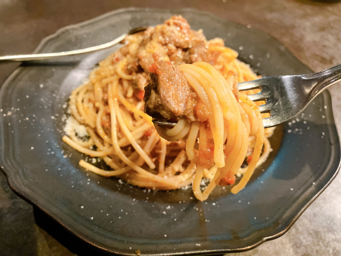 山口県萩市のブランド牛『長萩(ちょうしゅう)和牛』を使った贅沢なパスタで、お肉がゴロゴロ入っていて食べ応え満点! お肉の旨味と赤ワインの風味が食欲をそそり、感動の味わいです♡