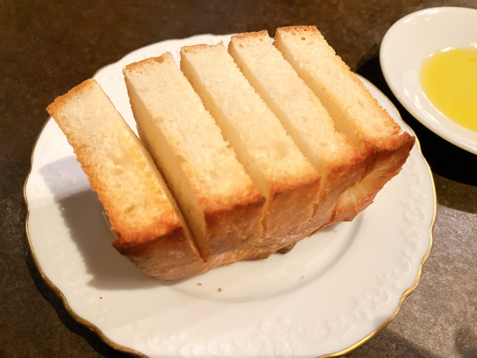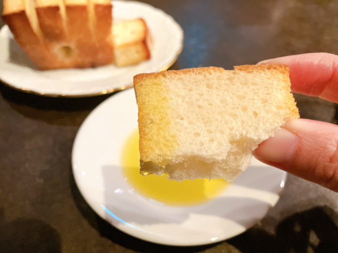 食べやすいように切れ目が入っていて、外はカリッと、中はふんわりした食感。チーズ入りのオリーブオイルにつけていただくと上品な味わいでした。